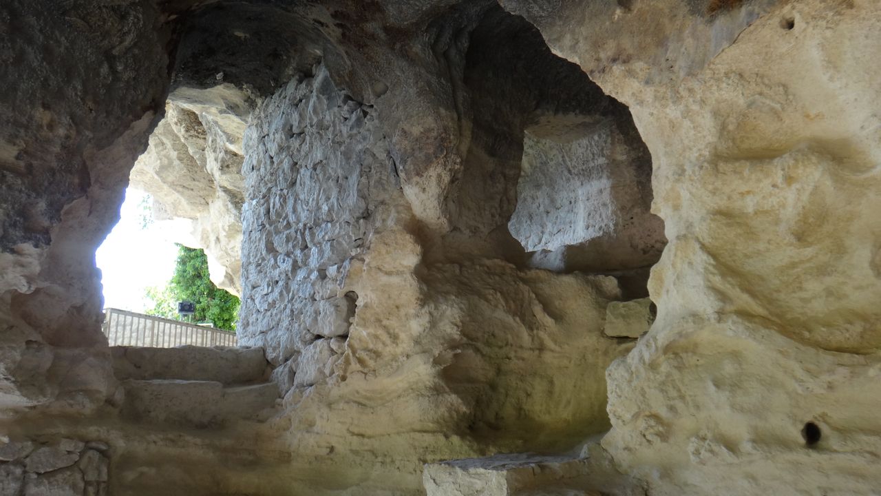 Мястото представлява комплекс от варовикови скални ниши и изсечени в скалата помещения с тесни коридори, стъпала и проходи, ниски тавани и груби неравни стени с плитки ниши. Вътре се открояват избледнели стенописи и надписи, малки прозоречни отвори и поставени табели/икони, както и дребни предмети и монети по пода и върху каменни платформи, създаващи усещане за старинно култово пространство. Достъпът и движението са организирани по дървени и изсечени тераси с метални парапети, които извеждат към дневна светлина и гледки към зелена гора, предлагащи силен контраст между тъмния скален интериор и откритото естествено обкръжение.