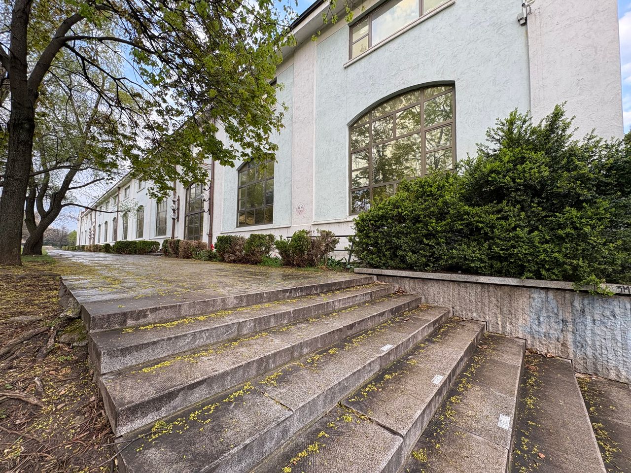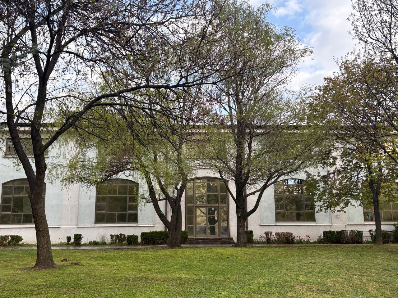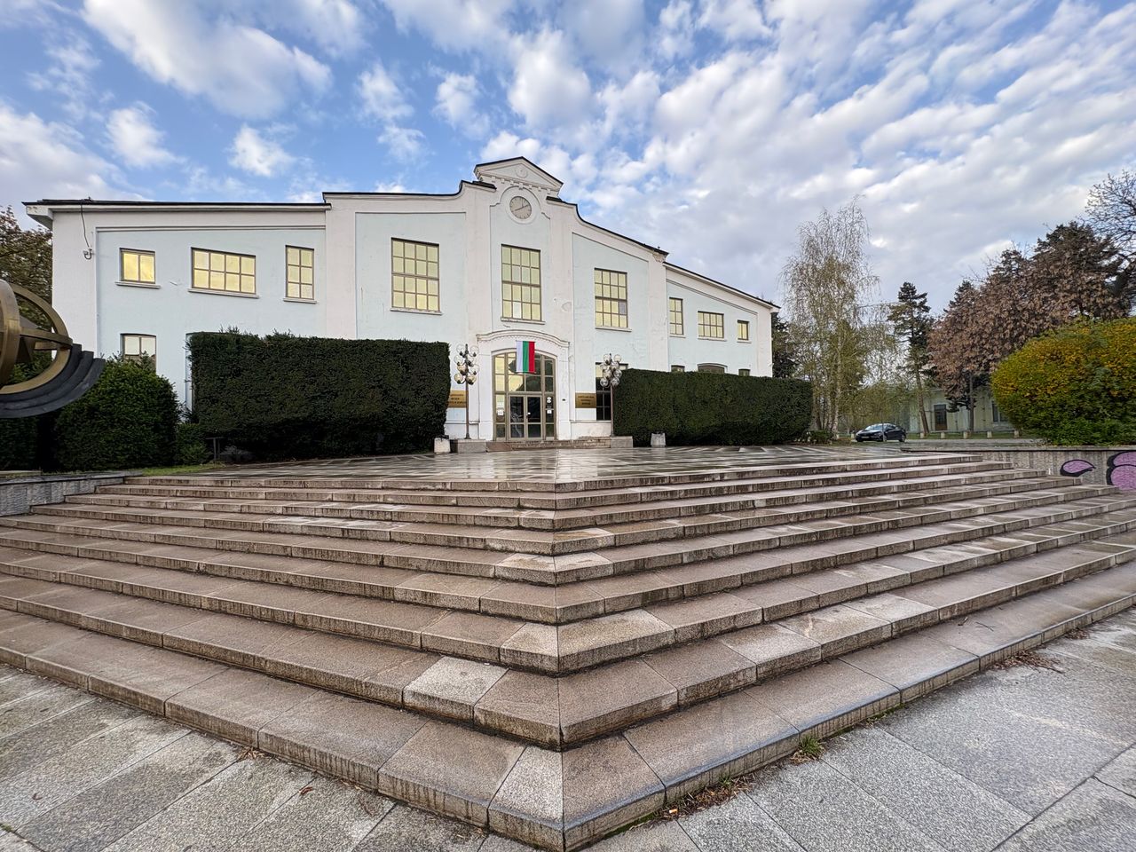 Голяма светла обществена/административна сграда с изразена симетрия, централен вход с широки стълби и фронтон с часовник и българско знаме, комбинираща правоъгълни и арковидни прозорци по дългата фасада. Пред нея има просторна площадка и подход с павирани и каменни настилки, пейки, подрязани живи плетове, ниски храсти и високи дървета, които оформят подредена, представителна среда. Локацията предлага чисти осови кадри към главния вход и възможности за движения по алеята и покрай фасадата, подходящи за институционални и официални сцени.