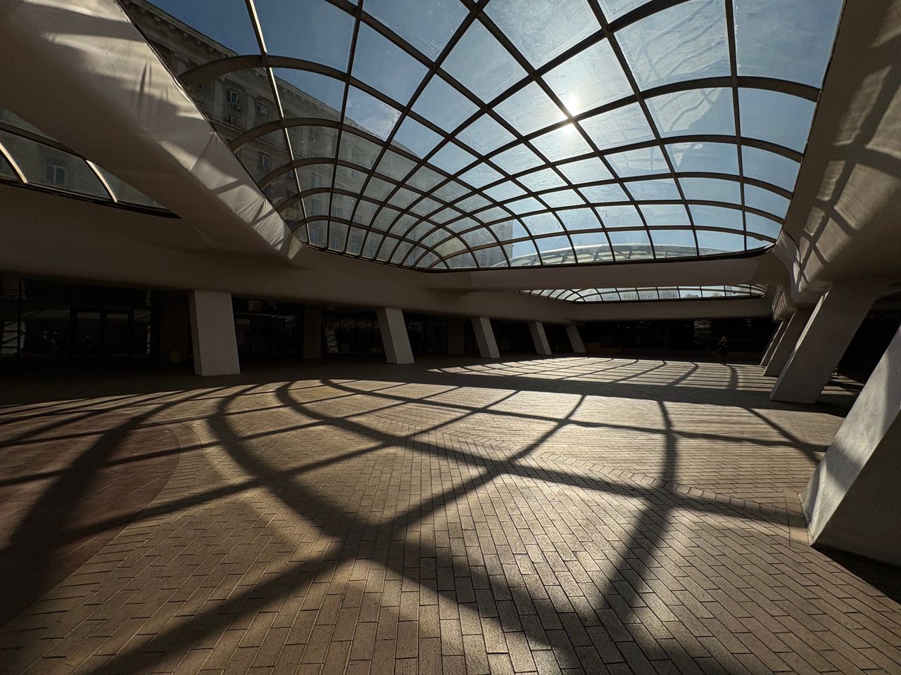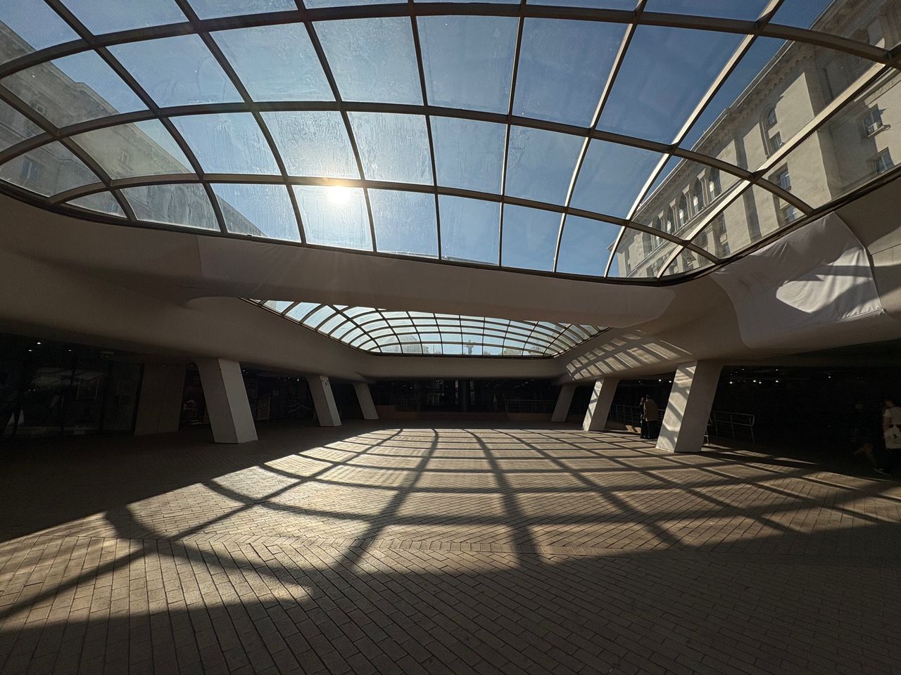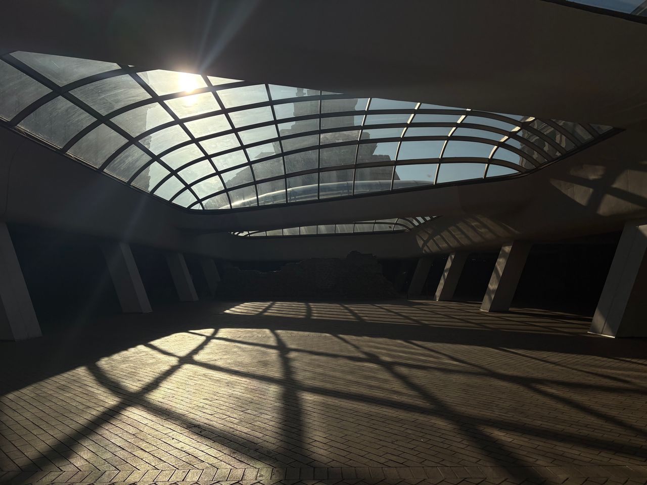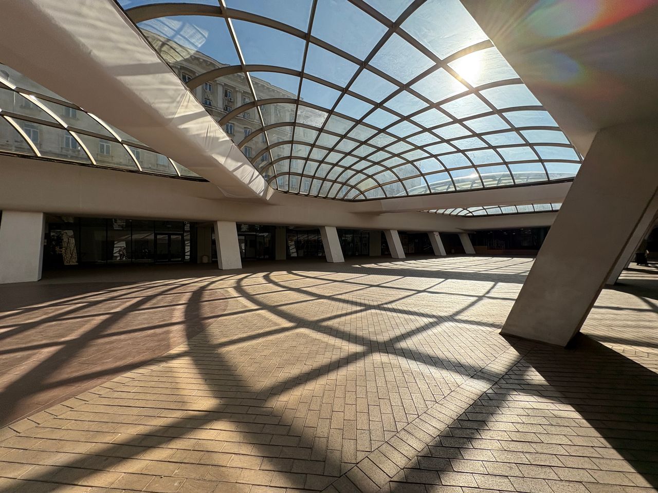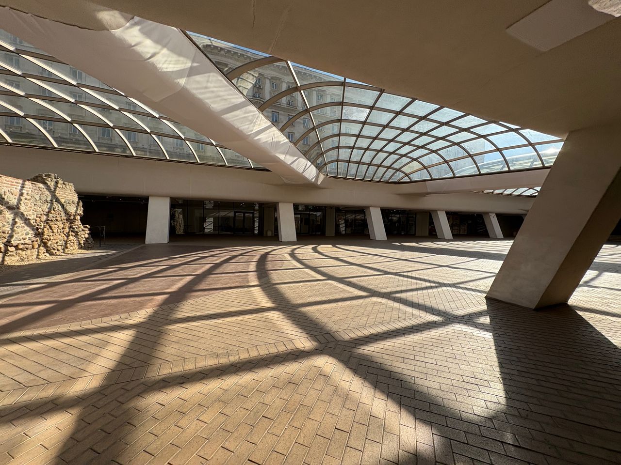 Широко покрито атриумно/площадно пространство в съвременен комплекс, доминирано от голям извит стъклен покрив върху метална решетка, който пропуска силна дневна светлина и създава характерни мрежести, геометрични сенки върху тухлената павирана настилка. Периметърът е оформен с масивни бели наклонени колони, парапети и редица остъклени входове и фасади, а на места се виждат и открити каменни руини. Локацията дава чист модерен, градски характер с драматични светлосенки и силна архитектурна графика, подходяща за комерсиални и културни сцени.