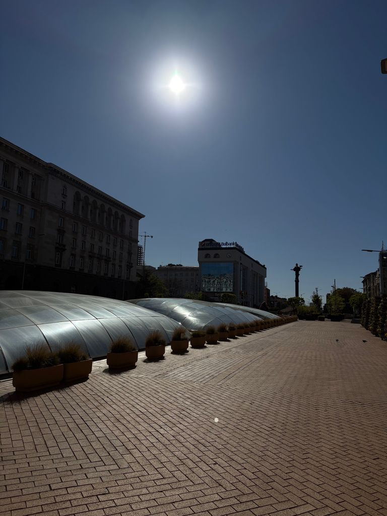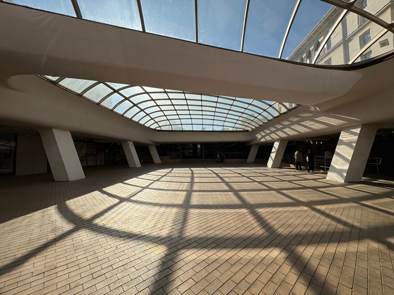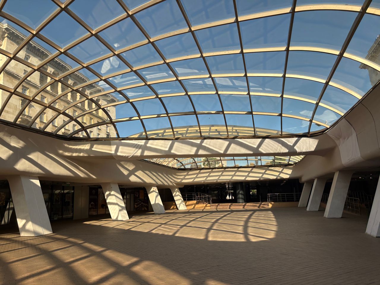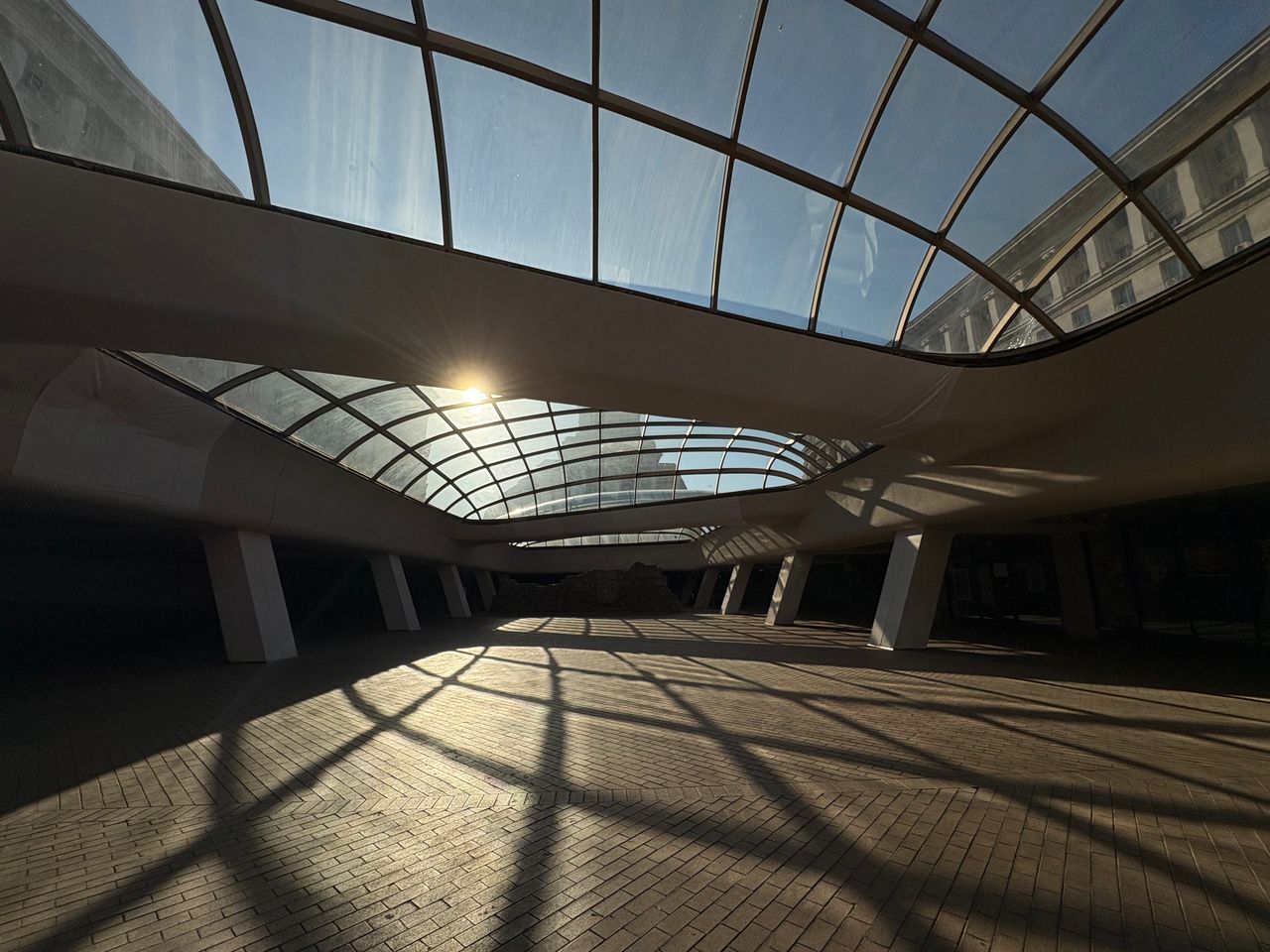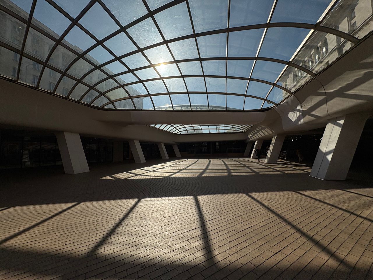Широко покрито атриумно/площадно пространство в съвременен комплекс, доминирано от голям извит стъклен покрив върху метална решетка, който пропуска силна дневна светлина и създава характерни мрежести, геометрични сенки върху тухлената павирана настилка. Периметърът е оформен с масивни бели наклонени колони, парапети и редица остъклени входове и фасади, а на места се виждат и открити каменни руини. Локацията дава чист модерен, градски характер с драматични светлосенки и силна архитектурна графика, подходяща за комерсиални и културни сцени.