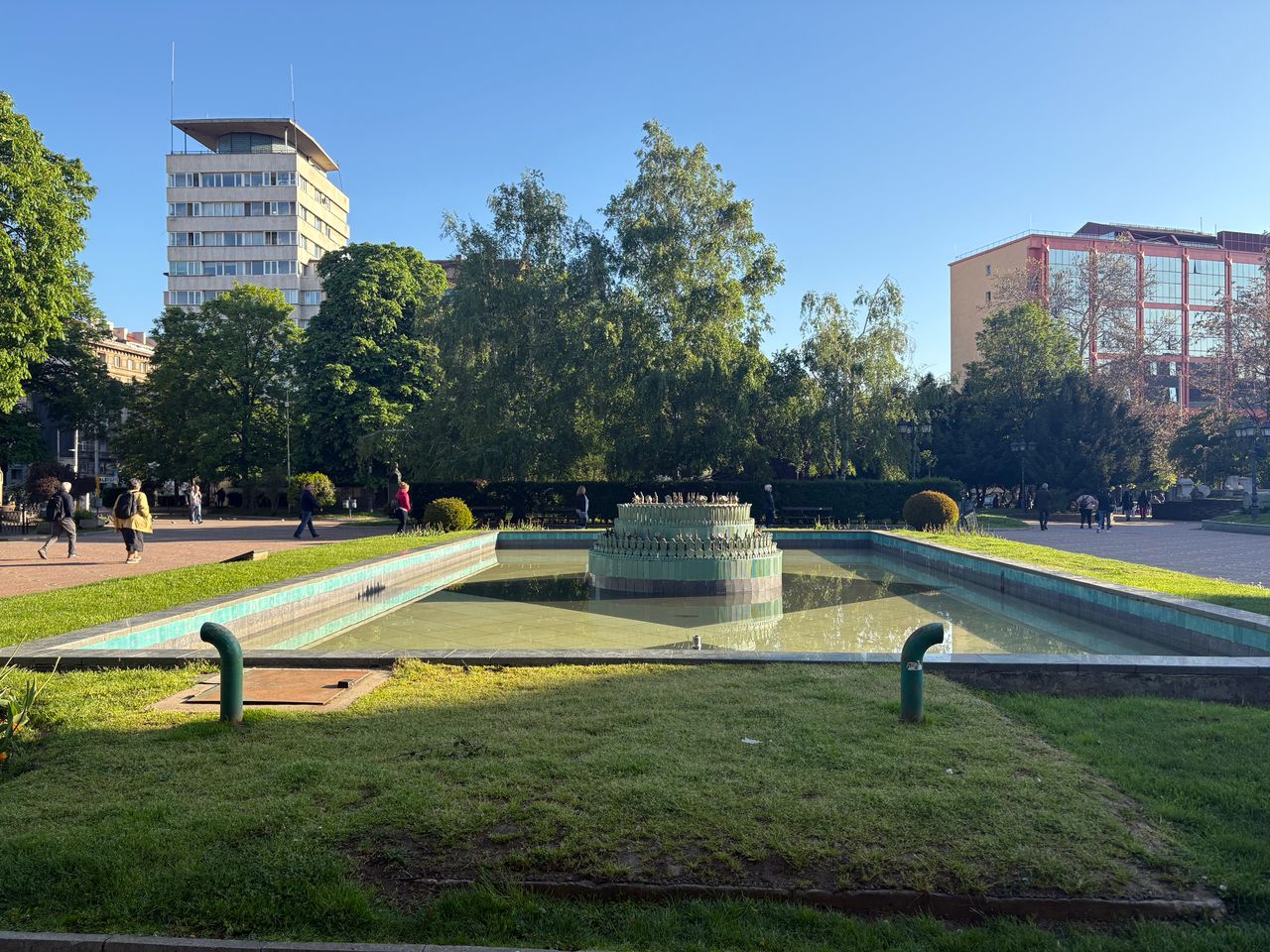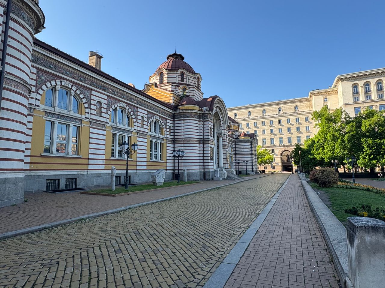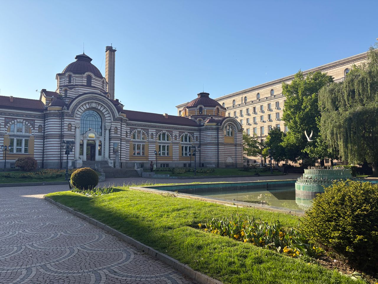 Локацията комбинира внушителна историческа обществена сграда със симетрична фасада на хоризонтални червено/жълто-бели ивици, аркадни прозорци, монументален централен вход с висока арка, остъклено поле над стълбище и куполни покриви с декоративни орнаменти. Пред нея има малък градски парк с павирани алеи, улични фенери, тревни площи и правоъгълно плитко водно огледало с централен фонтан, рамкирани от дървета и открито небе. В кадър може да се включи контрастът между историческата архитектура и високия правоъгълен административен корпус на заден план, което дава възможности за широки установъчни планове и динамични подходи към входа.