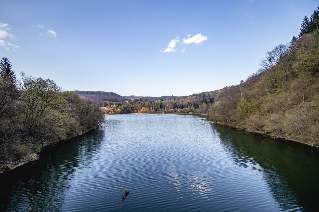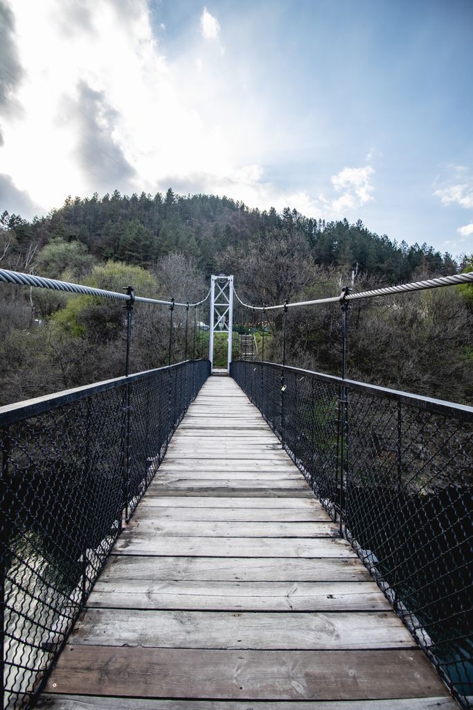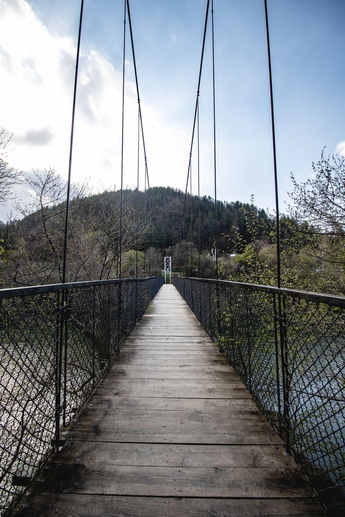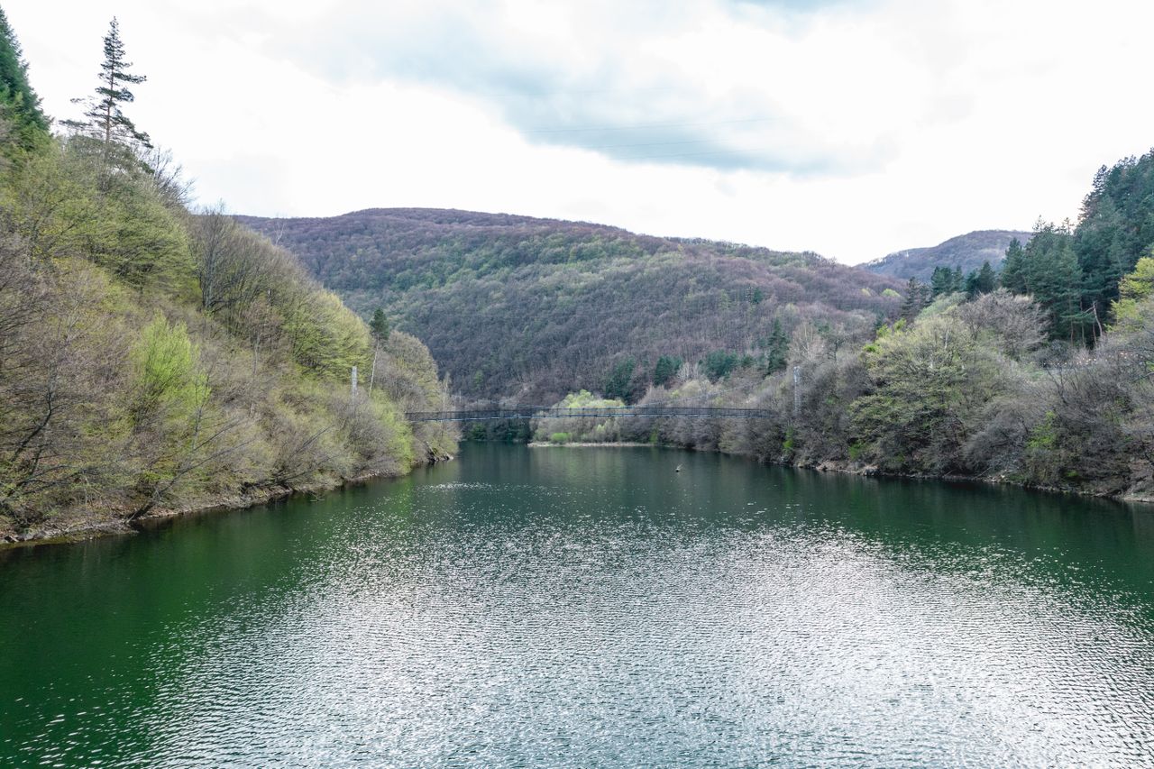 Локацията съчетава голямо езеро/язовир в долина, обградено от ниски гористи хълмове, с спокойни участъци с ясни отражения и зони с леки вълни под променливо, частично облачно небе. Над водата и гористата долина преминава дървен пешеходен висящ мост с метални въжета и мрежести парапети, а в далечината се вижда и по-тесен мост, пресичащ водната шир. По брега минава извита двулентова пътна отсечка с гориста ивица и малък паркинг до сграда, което дава удобен достъп и разнообразни кадри от пешеходна и транспортна инфраструктура в природна среда.
