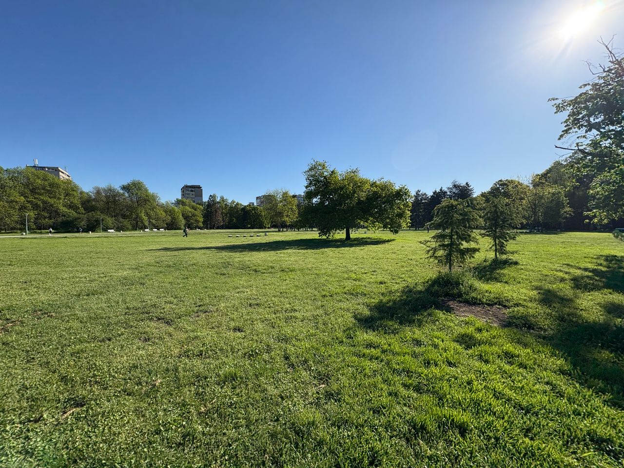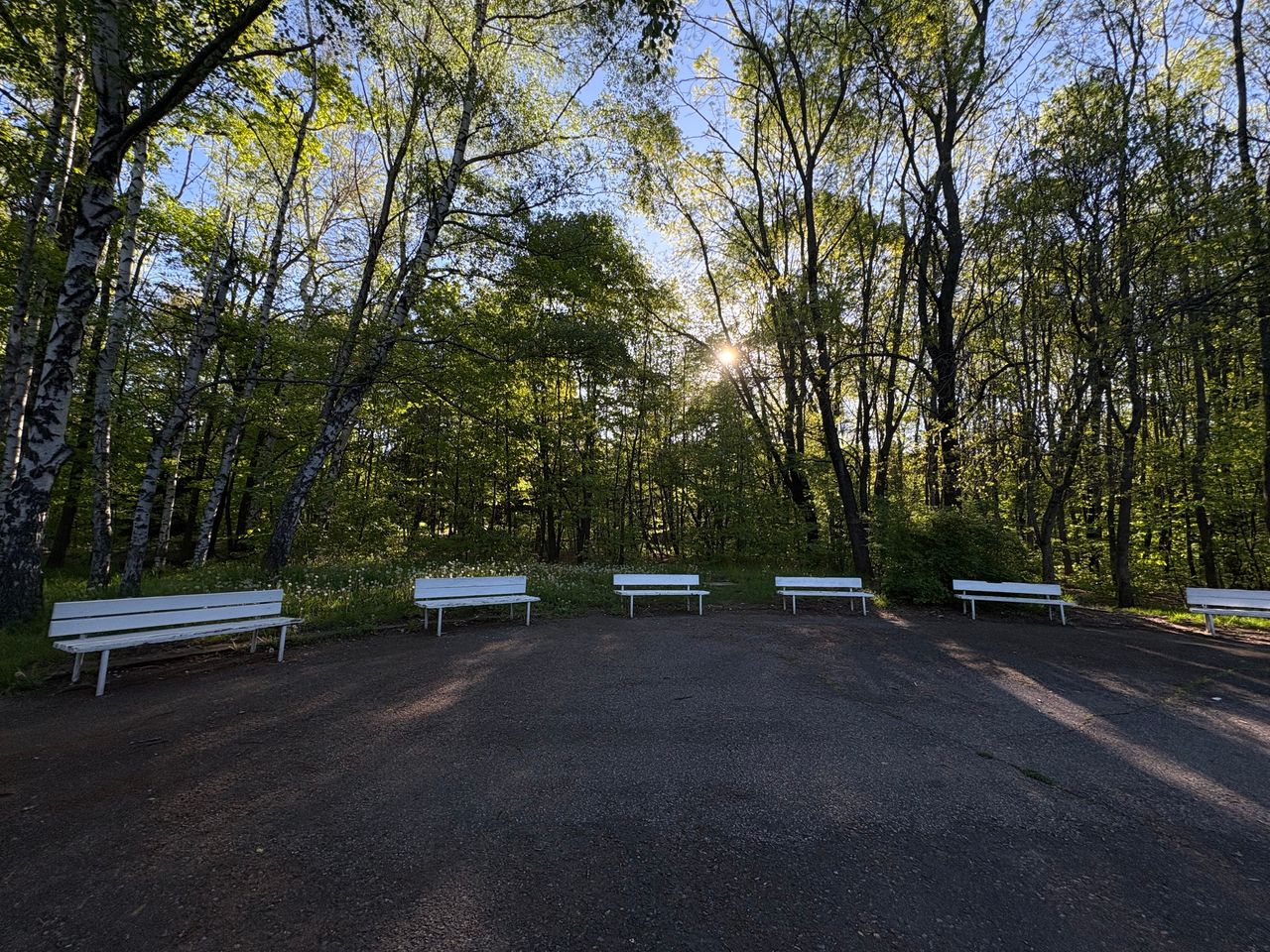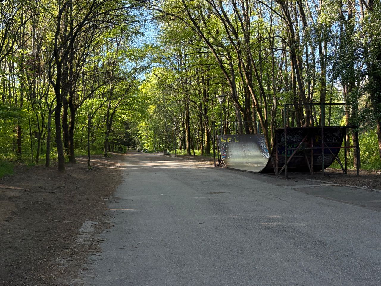 Локацията представлява голям градски горски парк с широки тревни поляни и дълги асфалтови алеи, обградени от високи дървета и гъста зеленина, където слънчевите лъчи пробиват през короните и създават изразителни петна светлина и дълги сенки. Има разнообразни зони за снимки – криволичещи каменни пътеки с пейки и малка беседка, открити площадки с подредени пейки, както и скейт рампа с графити и ограждение. Пространството дава усещане за спокойна рекреационна среда, а от някои точки се разкриват далечни силуети на високи сгради на фона на ясно небе.