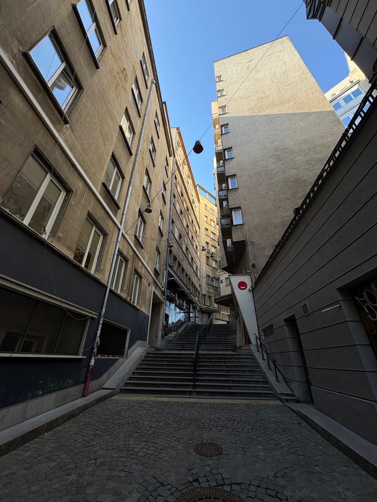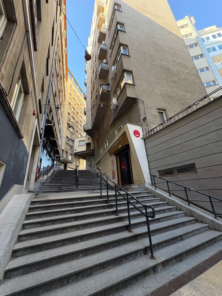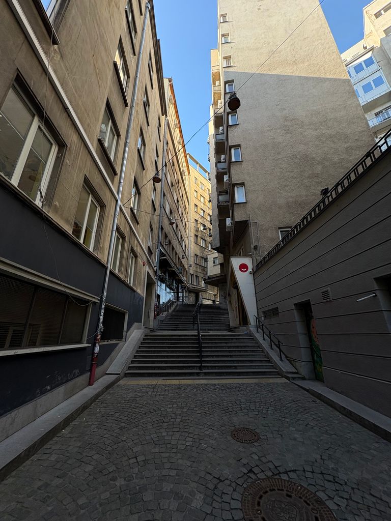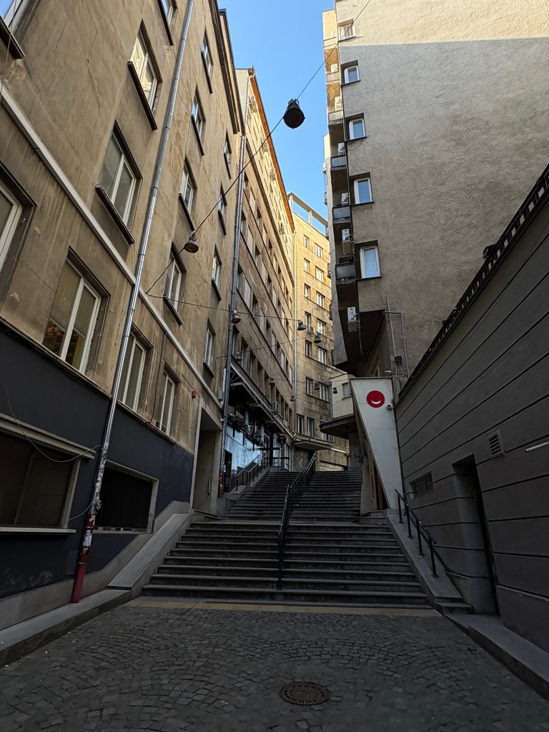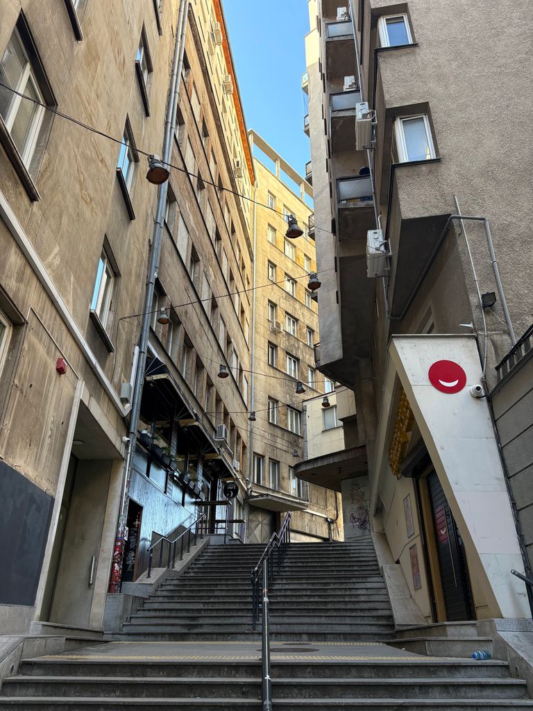 Тясна калдъръмена градска уличка между високи жилищни сгради с множество прозорци и балкони води към широко, стръмно външно стълбище с метални парапети, което изкачва към по-високо ниво. Над улицата и стълбите са опънати кабели с висящи улични лампи, по фасадите личат тръби, външни климатици и входове, а в кадър често доминира откритото небе между сградите. Локацията има силно вертикална перспектива и компактна градска атмосфера, подходяща за динамични проходни сцени и драматични кадри нагоре по стълбите.
