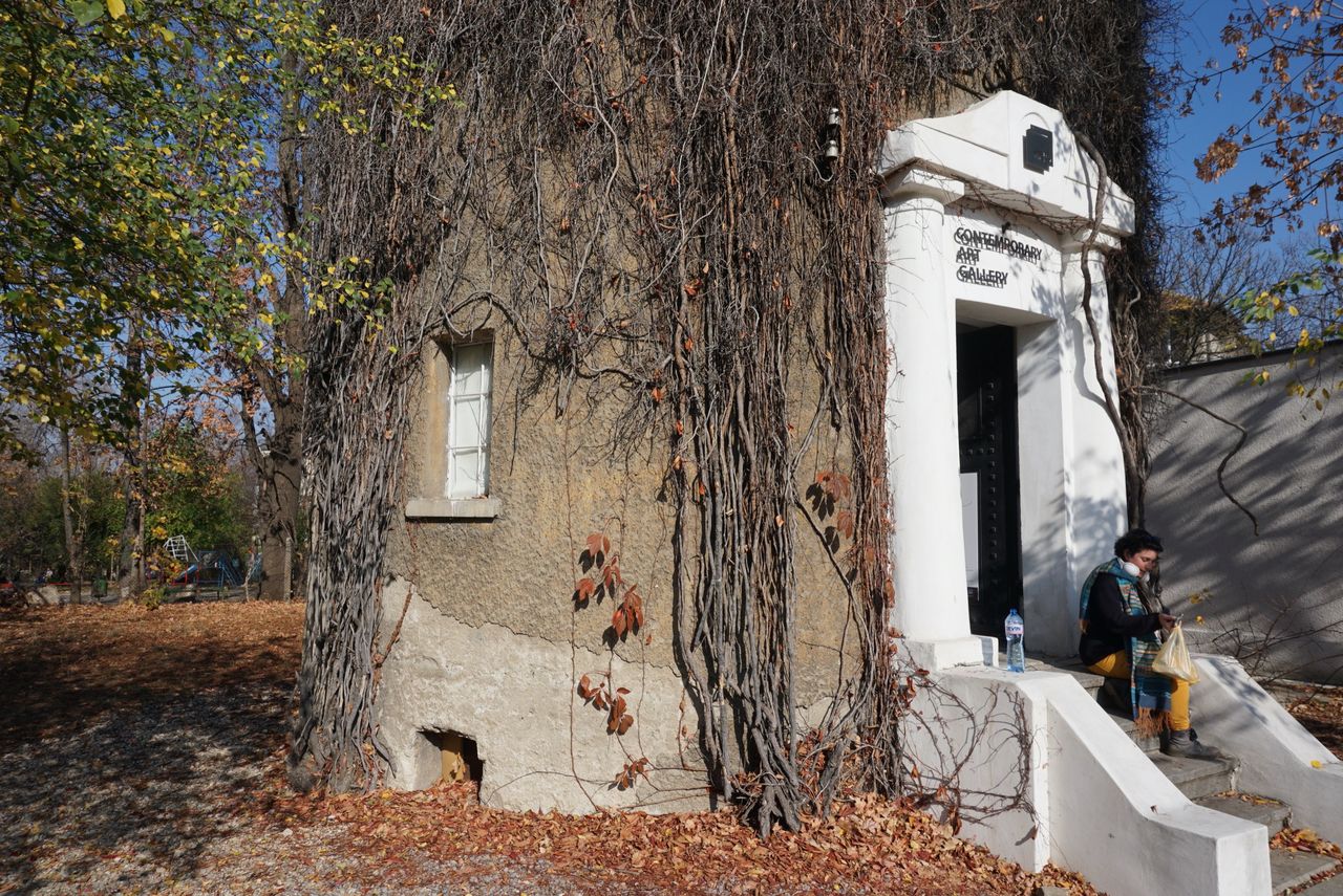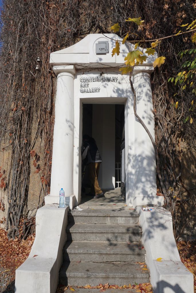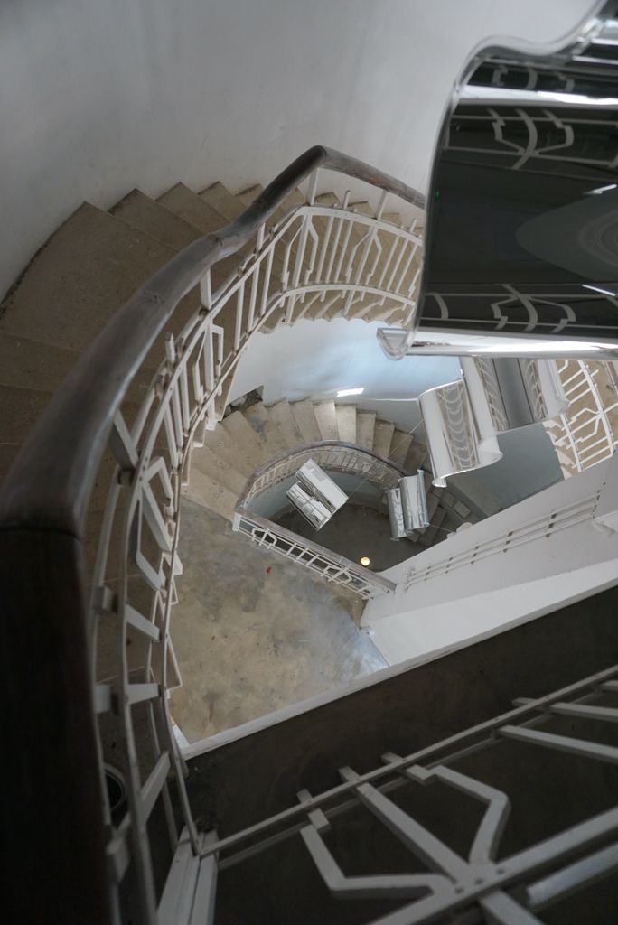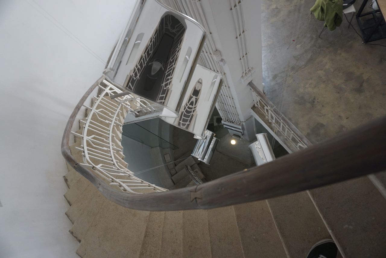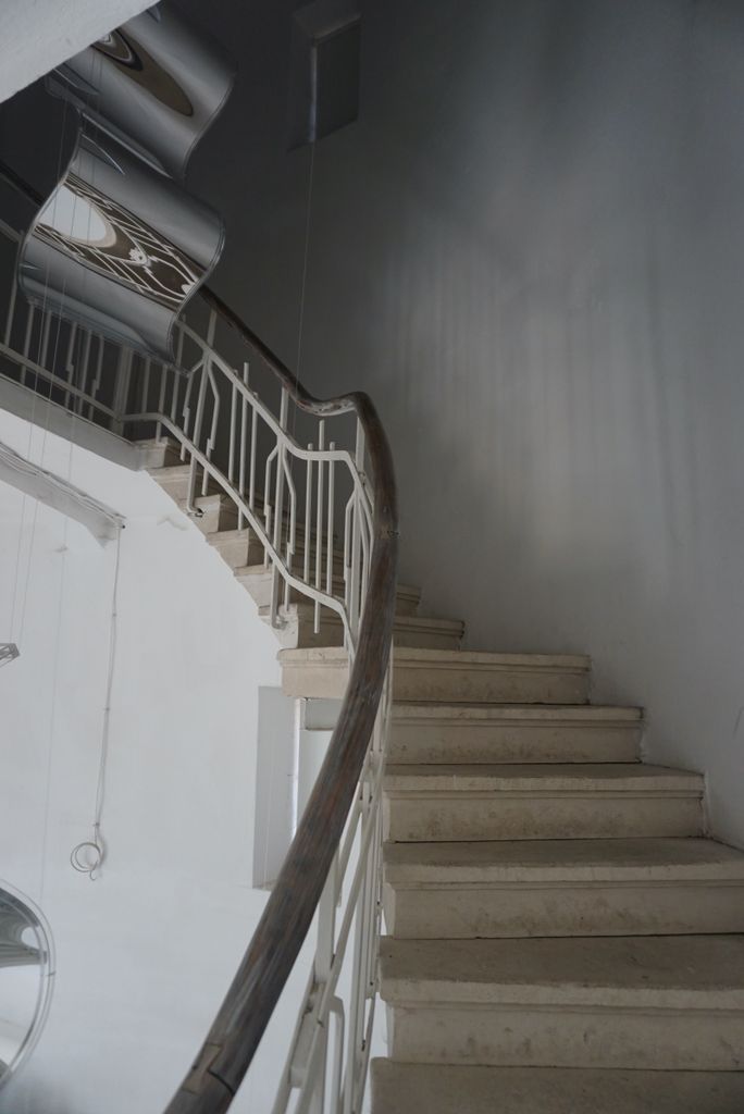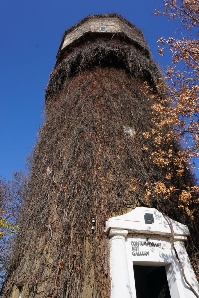 Локацията представлява галерия за съвременно изкуство в историческа сграда с характерна висока цилиндрична водна кула, почти изцяло обрасла с бръшлян и сухи лиани, на фона на ясното небе и есенна растителност около ограденото пространство. Входът е бял, с колони и фронтон, до който водят бетонни стъпала, а фасадите са с стара мазилка и прозорци, частично скрити от увивни растения. Интериорът предлага тясна стълбищна клетка през няколко нива със завиващи/спираловидни стъпала (камък/бетон), бели метални парапети с геометричен орнамент и извита дървена ръкохватка, както и шахта с асансьор, подходящи за драматични вертикални кадри и атмосферни преходи между етажи.